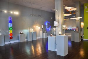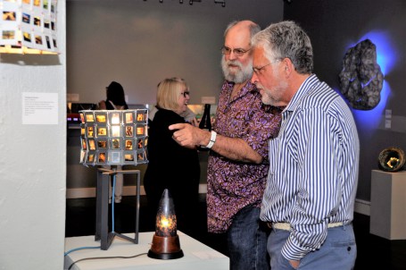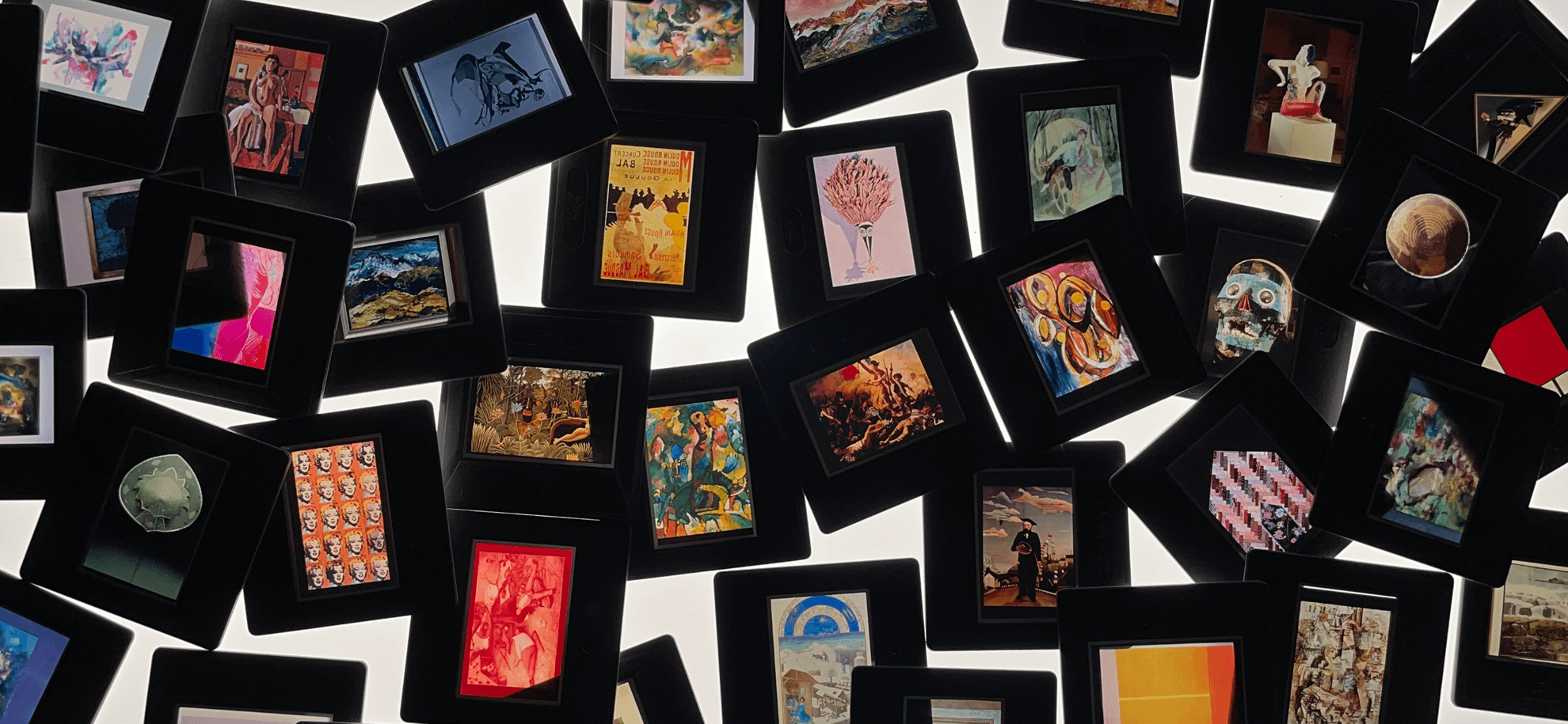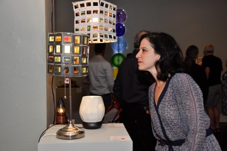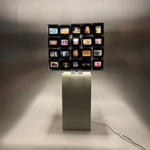 $220.00Clean lines with contemporary art slides define this piece. Each slide has glass on both sides, electrical wire is used to connect the slides adding a stitching pattern. The base is wrapped in white leather. 20.5 inches tall, 6 inches deep and 9.75 inches wide.