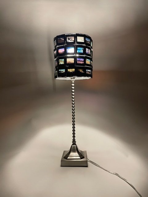 This tall elegant upcycle lamp has a variety of nature and classic art slides. With glass on both sides of each slide, these slides are attached with electrical wire and silver jump rings. 26” tall and 8” deep.