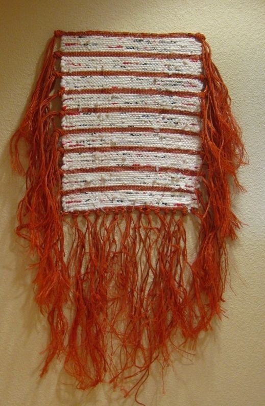 This weaving is part of a community effort to promote the recycling of plastic farm twine used to bale hay. The weaving is entitled “Farm to Market” because plastic grocery bags were also used in the weaving. Both of these discarded materials, if not recycled, pollute our land and water, if buried and pollute our air, if burned.