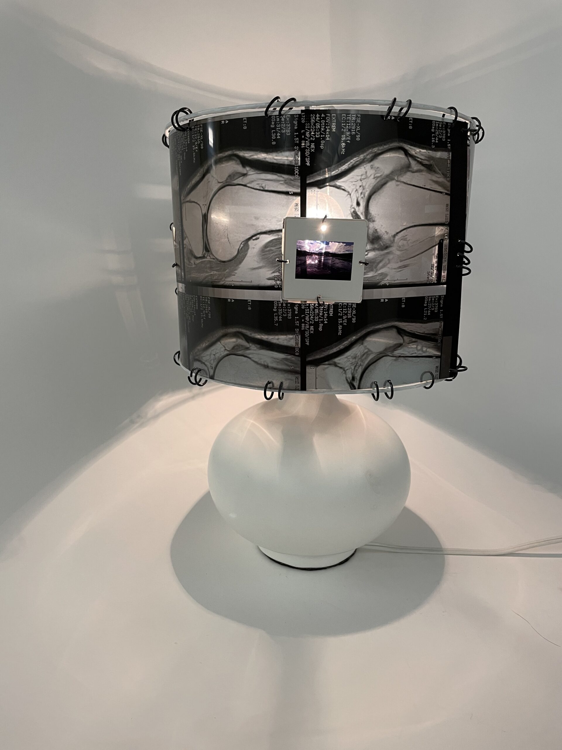 This lamp utilizes a discarded Xray of a knee and photo slide to add color and interest.